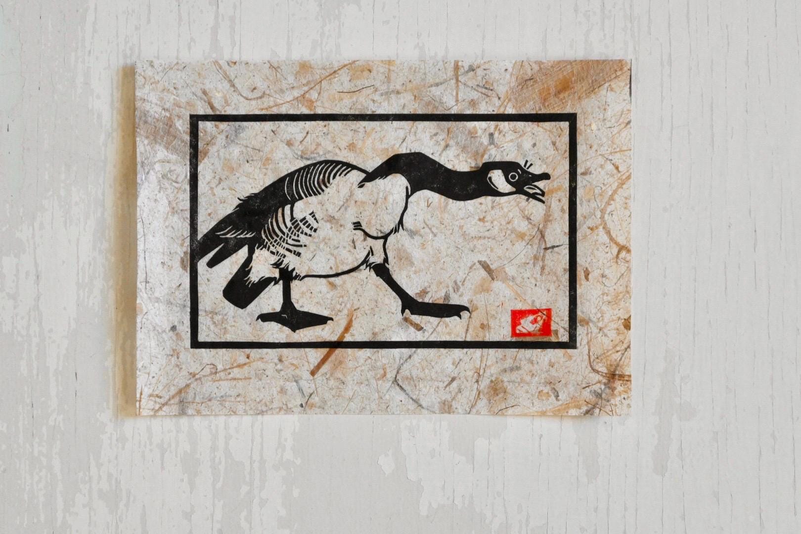 This lino print captures the unmistakable attitude of a hissing Canada goose—feisty, bold, and full of character. I wanted to highlight the goose’s dramatic stance and fierce personality in this hand-carved and printed artwork.