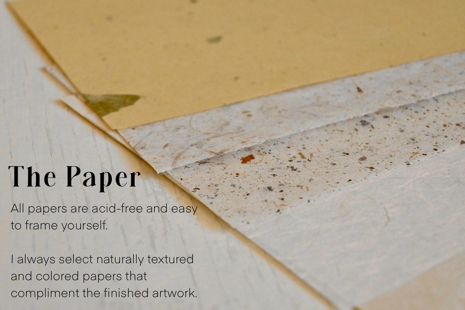 Paper: Acid-free and eco-friendly, this handmade paper is crafted in Nepal from the Lokta bush, which regrows after harvesting. The paper is a soft, natural off-white color and provides a beautifully textured backdrop for the print.